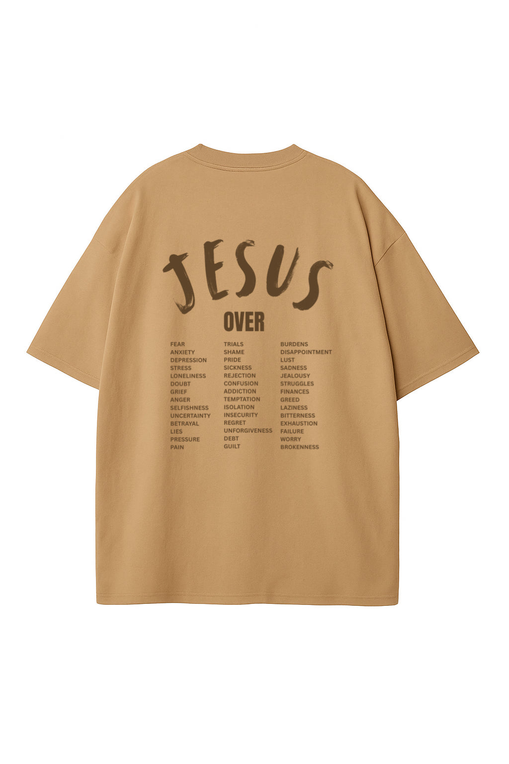 This design features the powerful message “Jesus Over Everything” reminding us that Christ reigns over every battle we might face. The design lists real-life struggles, but boldly places the name of Jesus above them all — because He is greater.